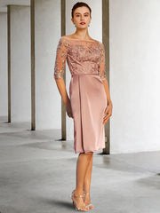 Sheath / Column Mother of the Bride Dress Vintage Elegant Jewel Neck Knee Length Lace Charmeuse Half Sleeve with Appliques Side-Draped