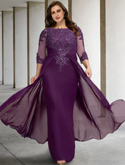 Sheath / Column Plus Size Curve Mother of the Bride Dresses Elegant Dress Formal Wedding Guest Floor Length Half Sleeve Jewel Neck Chiffon with Ruched Beading Appliques