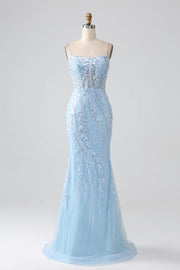 Sky Blue Sparkly Mermaid Corset Prom Dress with Sequins