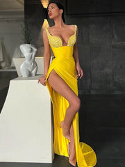 Stretch Crepe Sequin V-neck Sleeveless Yellow Prom Dresses Long