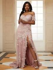 Tulle Applique Off-the-Shoulder Sleeveless Long Prom Dresses