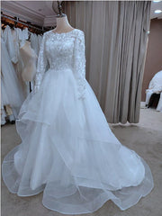 A-Line Wedding Dresses Jewel Neck Court Train Lace Tulle Long Sleeve Formal Romantic Luxurious with Appliques Cascading Ruffles