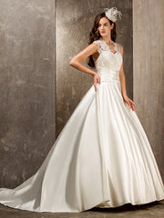A-Line Wedding Dresses Queen Anne Lace Satin Sleeveless See-Through with Sash Ribbon Beading Appliques