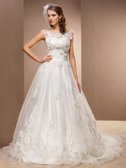 A-Line Wedding Dresses Scoop Neck Chapel Train Lace Organza Sleeveless with Sash Ribbon Beading Appliques