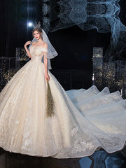 Ball Gown Wedding Dresses Off Shoulder Cathedral Train Tulle Lace Over Satin Sleeveless Formal Elegant with Crystals Embroidery