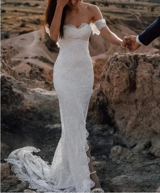 Beach Boho Lace Mermaid Backless Sleeveless White Wedding Gowns