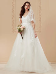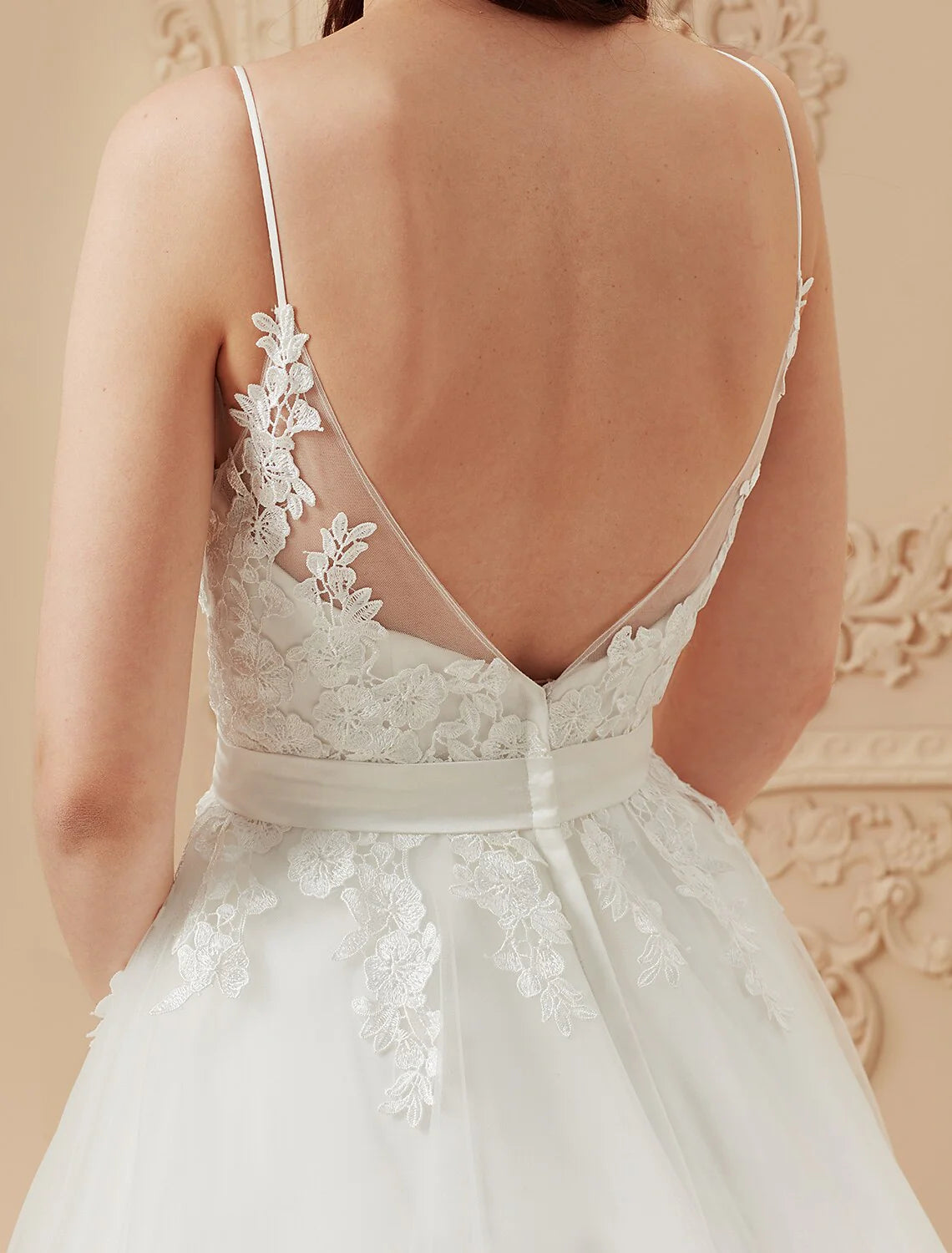 DingjiBall Gown Wedding Dresses V Neck Sweep / Brush Train Satin Tulle Over Lace Spaghetti Strap Romantic Illusion Detail Backless with Ruffles Appliques