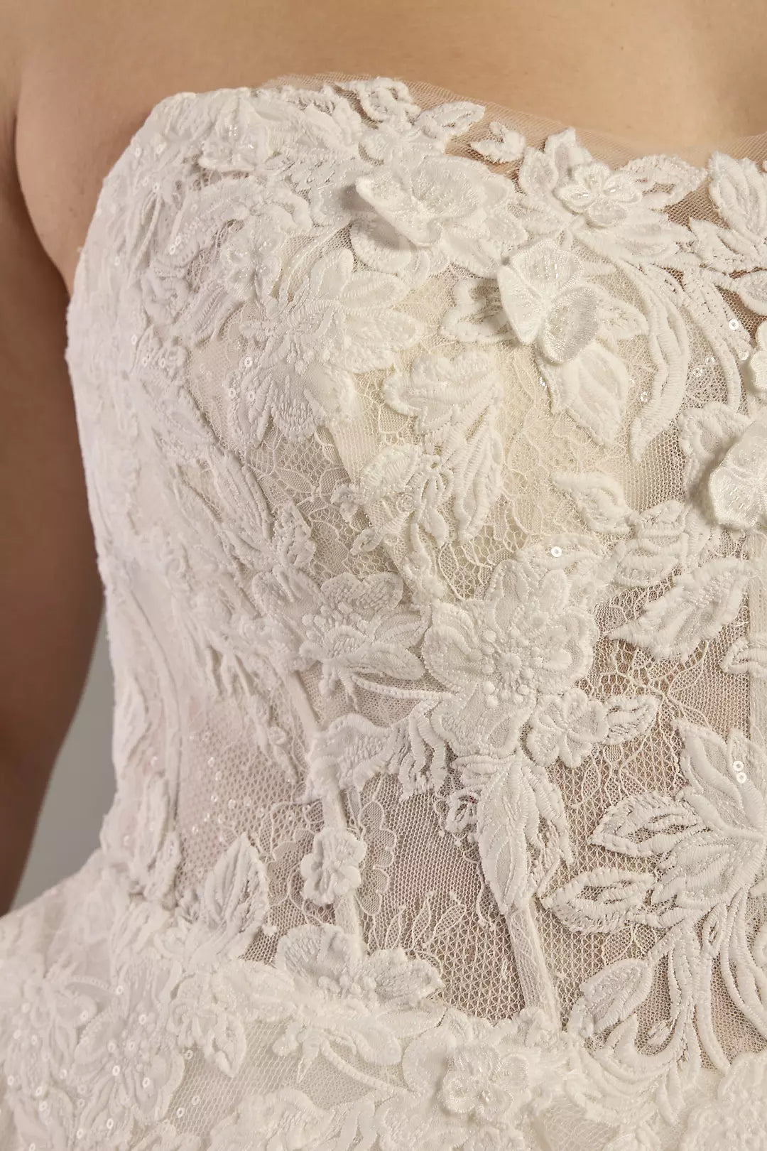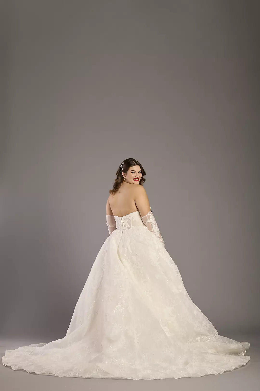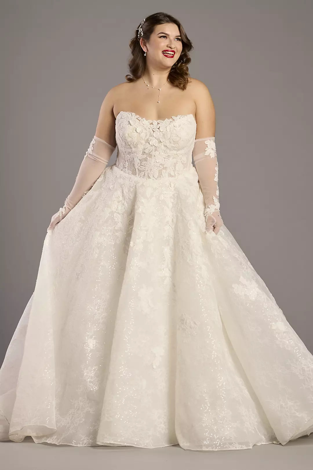 Elegant Strapless Lace Ball Gown Wedding Dress with Detachable Mesh Gloves and Sparkle Tulle Chapel Train