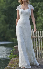 Floor-Length Square Cap-Sleeve Appliqued Lace Wedding Dress - US 2 / UK 6 / EU 32