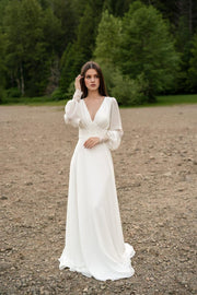 Ivory Lace Wedding Dress Long-sleeve Button Back Long Train Gown Open Back Lace & Chiffon