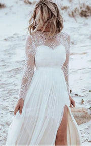 Lace Bateau A Line Tulle Floor-length Wedding Dress with Split Front and Pleats