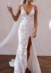 Mermaid V Neck Lace Boho Wedding Dresses with Slit