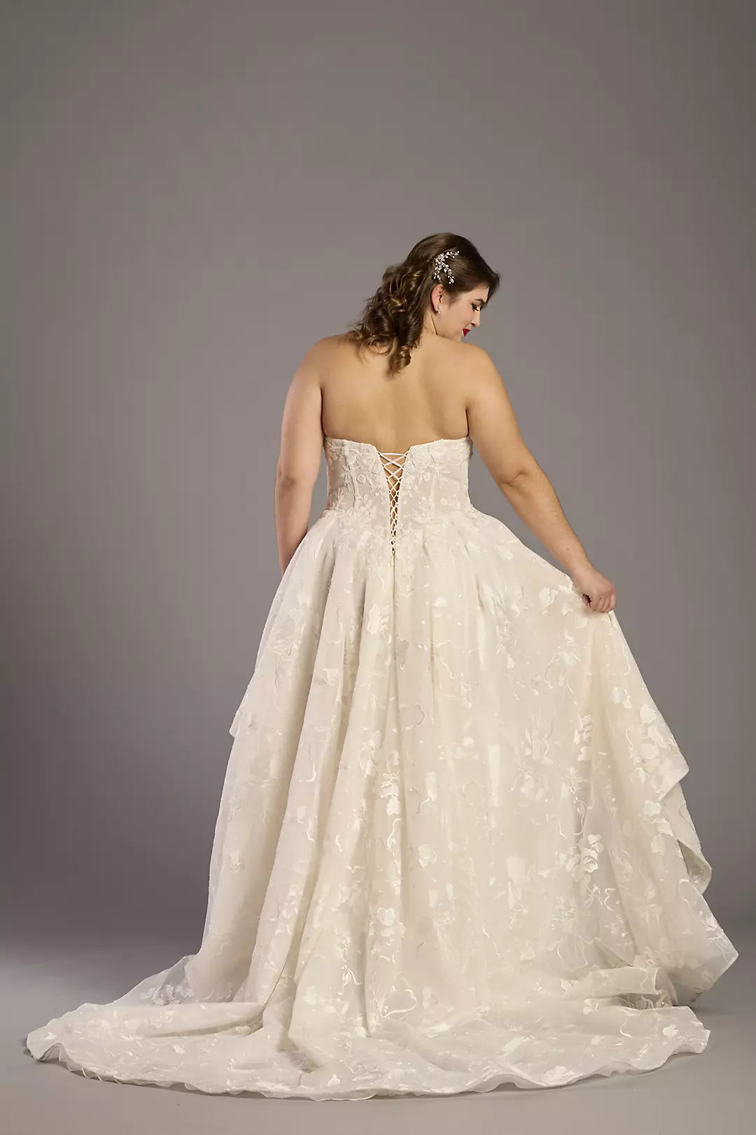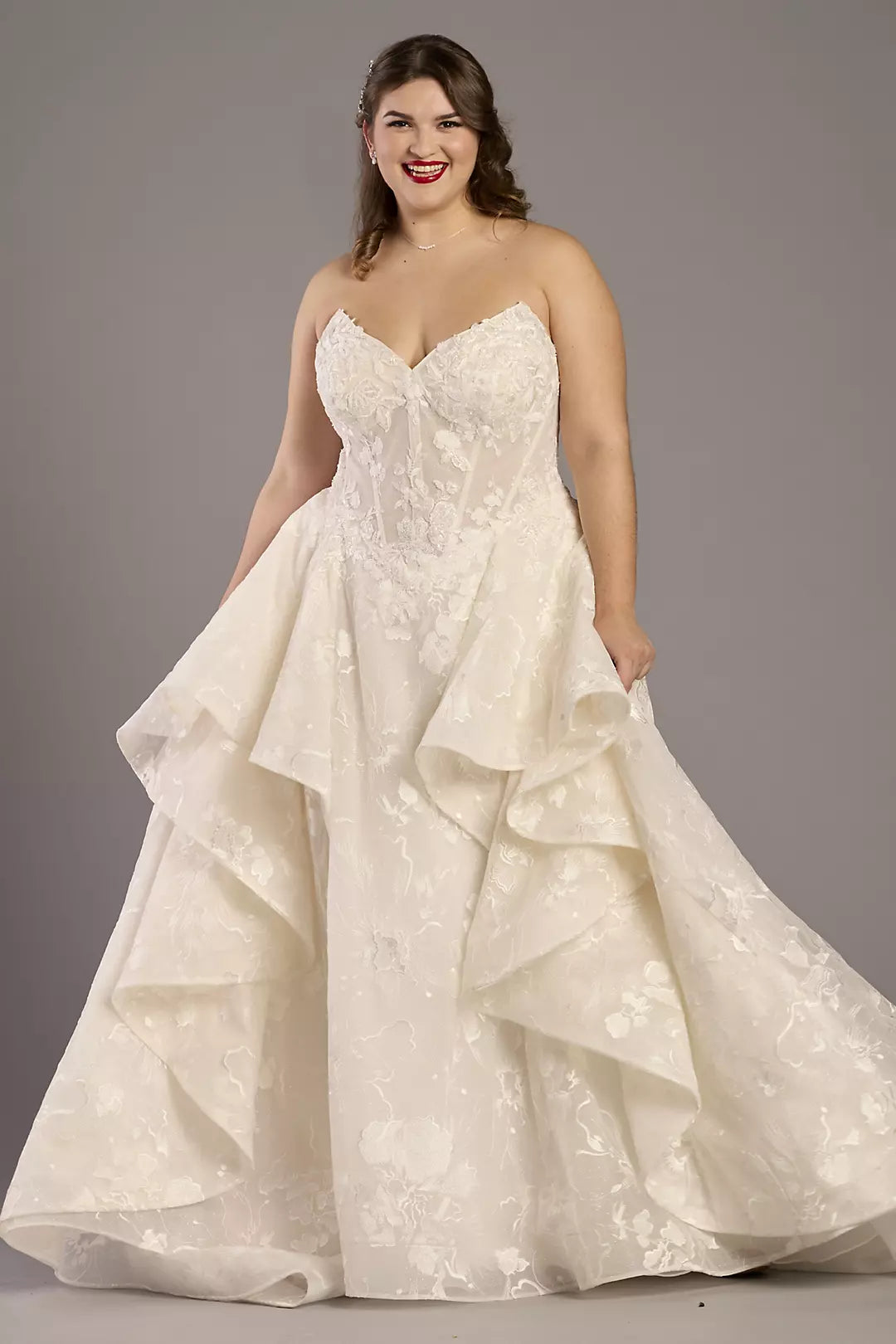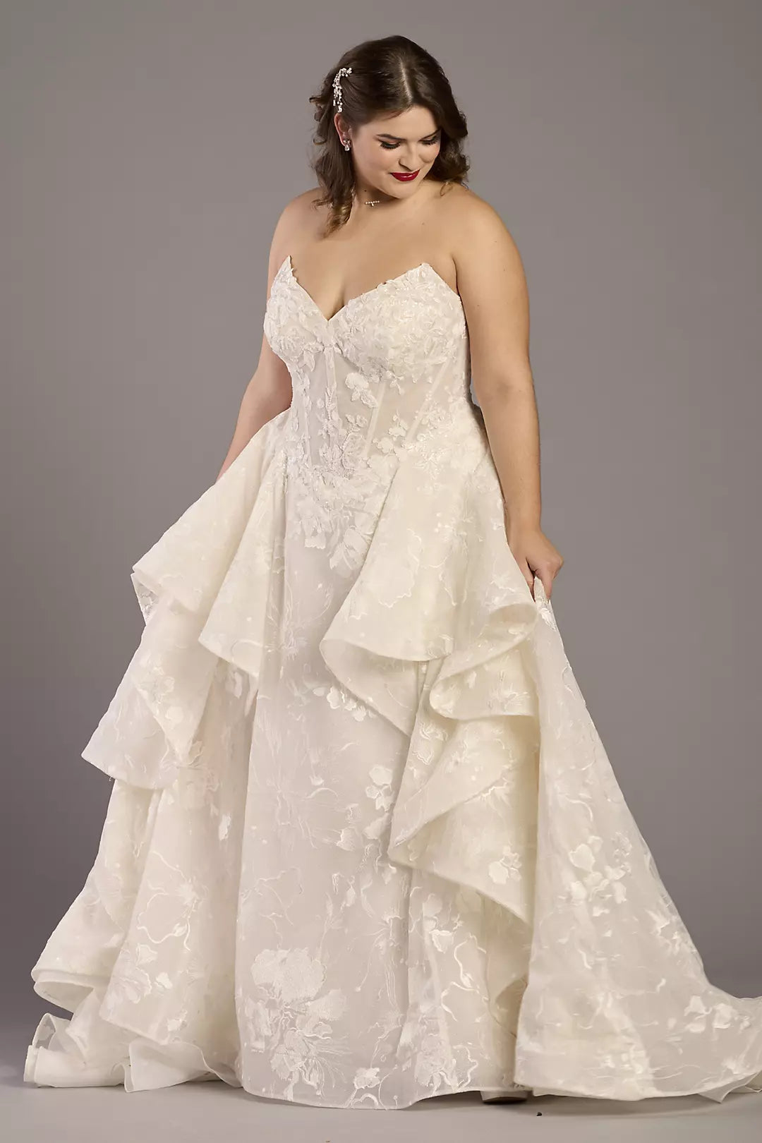 Romantic Strapless 3D Floral Lace Ball Gown Wedding Dress with Ruffle Skirt and Lace-Up Back