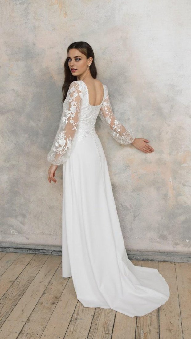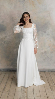 Square Neck Wedding Dress With Puff Sleeves Flower Lace A Line Wedding Dress