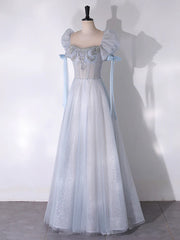 A-Line Scoop Neckline Tulle Light Blue Long Prom Dress
