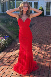 Applique V-Neck Lace-Up Mermaid Long Prom Dress with Slit