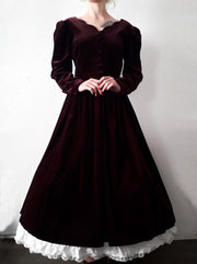 Beautiful Vintage Maxi Velour Velvet Cotton Wine Burgundy Romantic Tea Princess Evening Puffy Long Sleeves Full Skirt