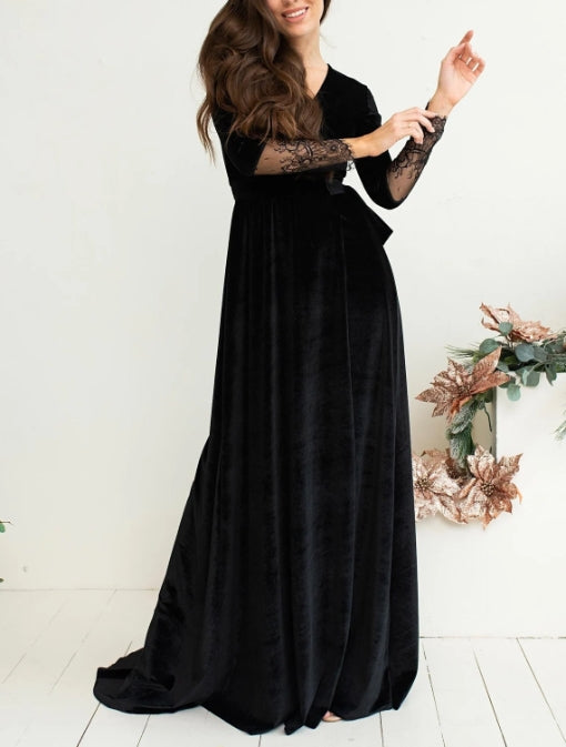 Black Velvet Dress V Neck Wrap Dress A-line Dress Maxi Dress with Long Lace Sleeves Prom Long Train Dress