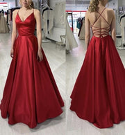 Burgundy A-Line Spaghetti Straps V-Neck Long Open Back Prom Dresses