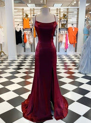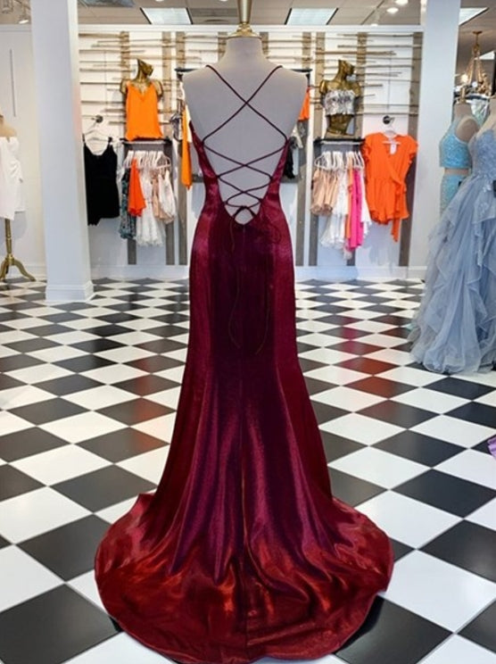 Burgundy Mermaid Split Front Prom Dresses With Criss Cross Straps