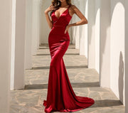 Burgundy V-Neck Double Spaghetti Strap Mermaid Backless Prom Dresses - US 2 / UK 6 / EU 32