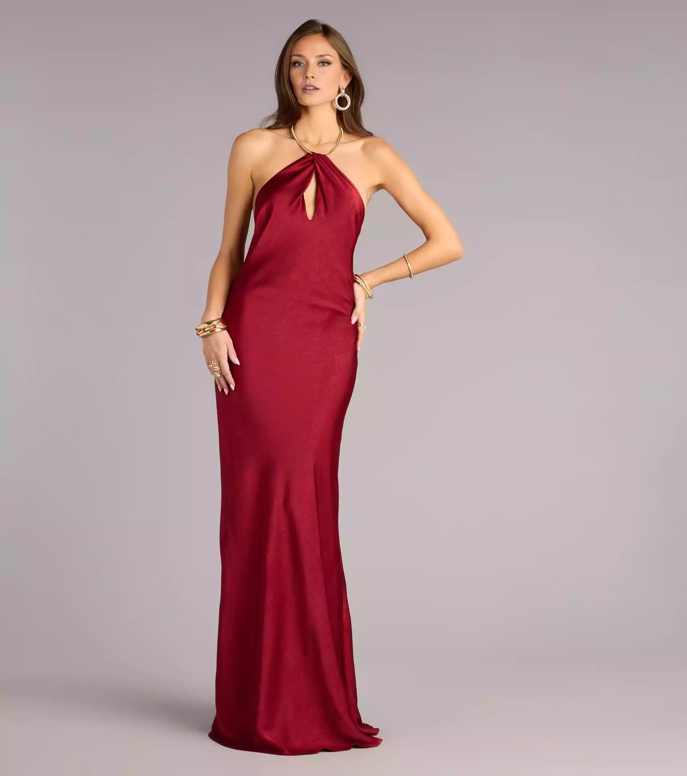 Charming satin halter neckline, backless, adjustable shoulder straps, draped pleats, mermaid silhouette and hemline Prom Dresses