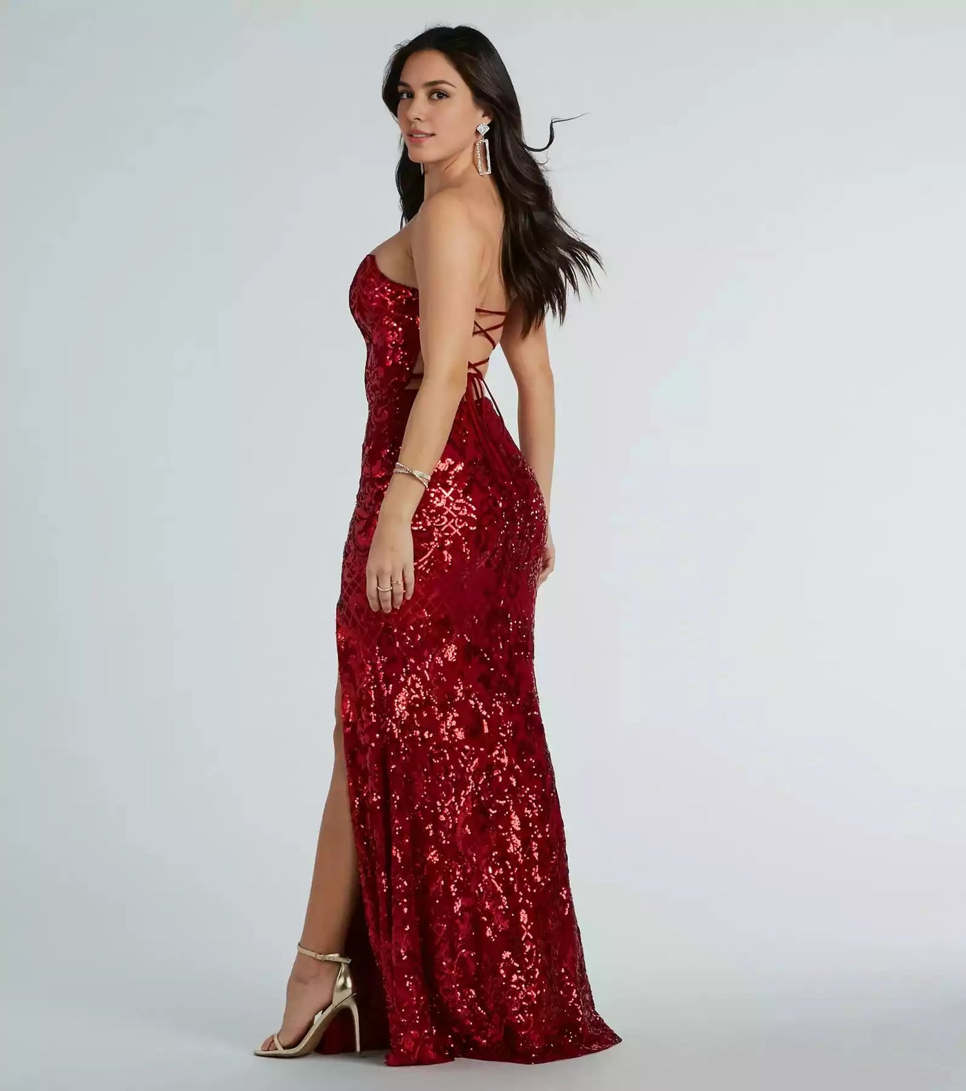 Elegant and chic strapless heart-shaped neckline with exposed back strap, A-line silhouette, front high slit, Prom Dresses - US 2 / UK 6 / EU 32