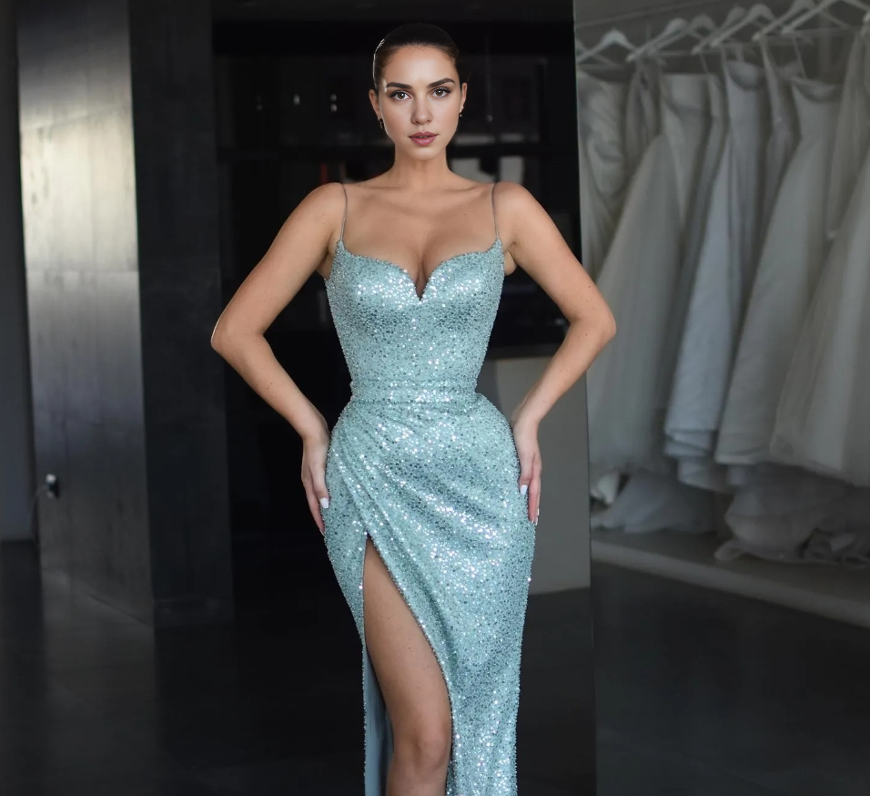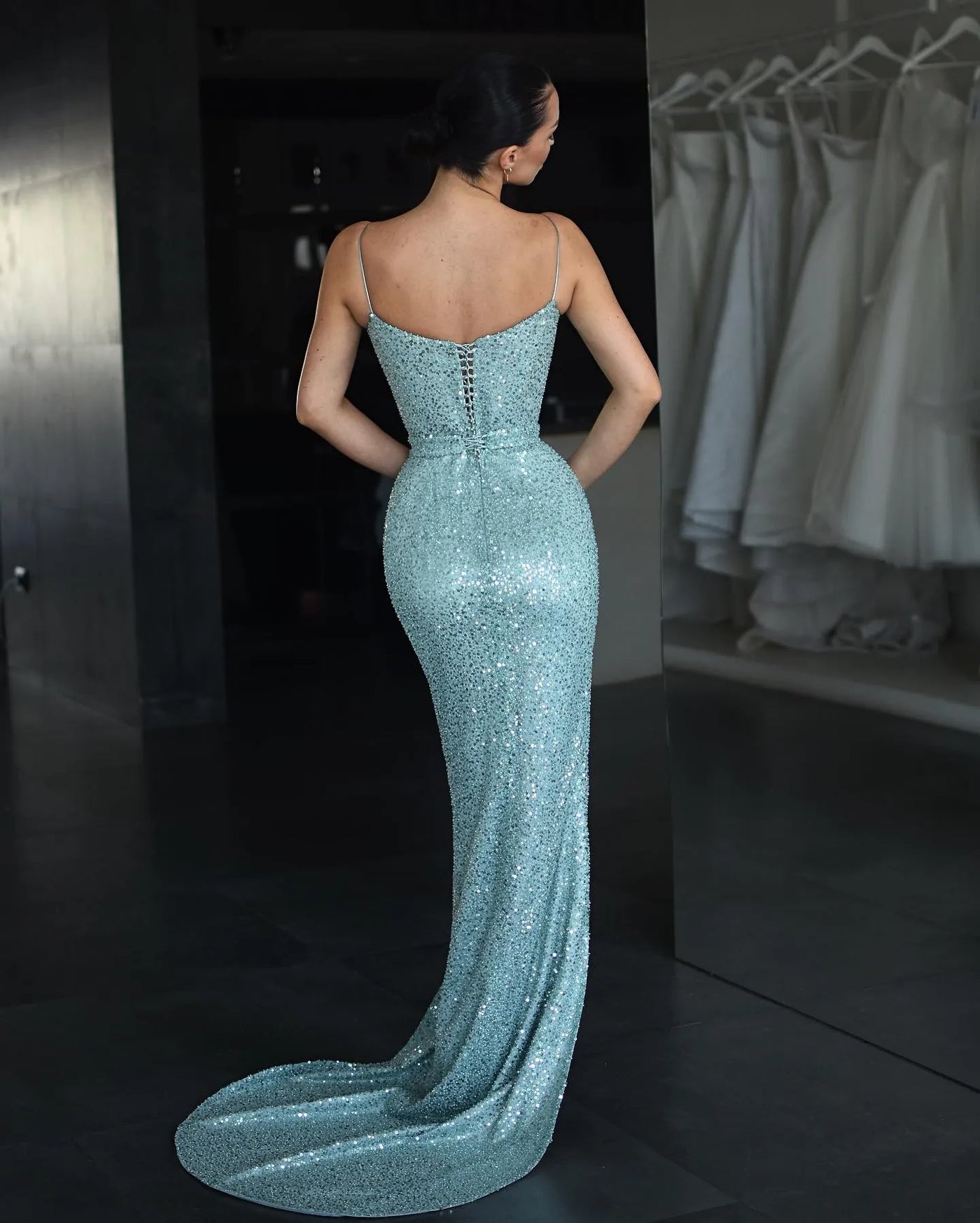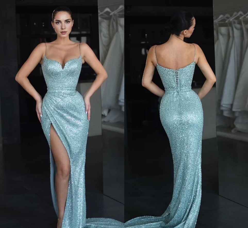 Elegant Blue Mermaid Prom Dresses Spaghetti Sequins Evening Dress Lace Up Back Pleats Split Formal Long Special Occasion Party dress