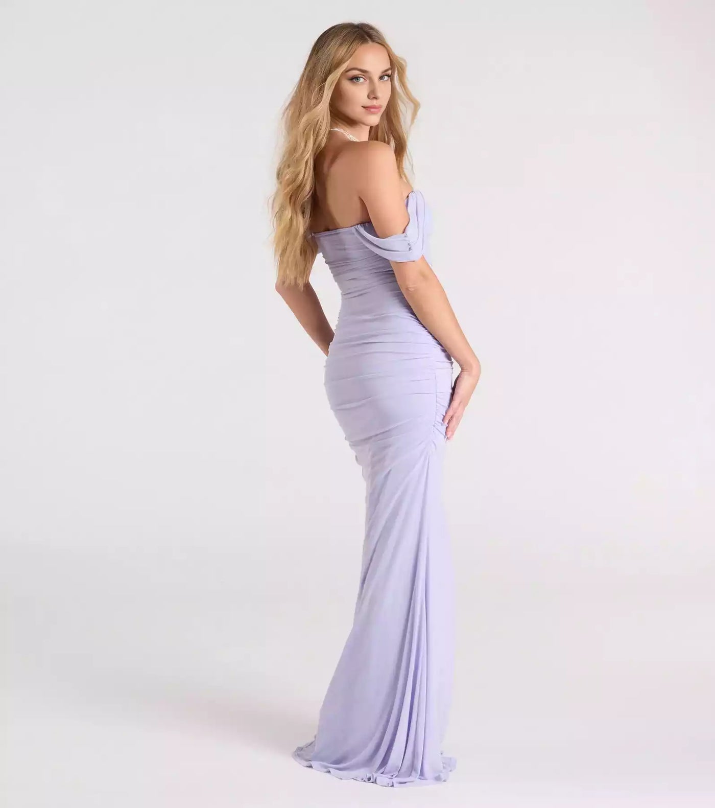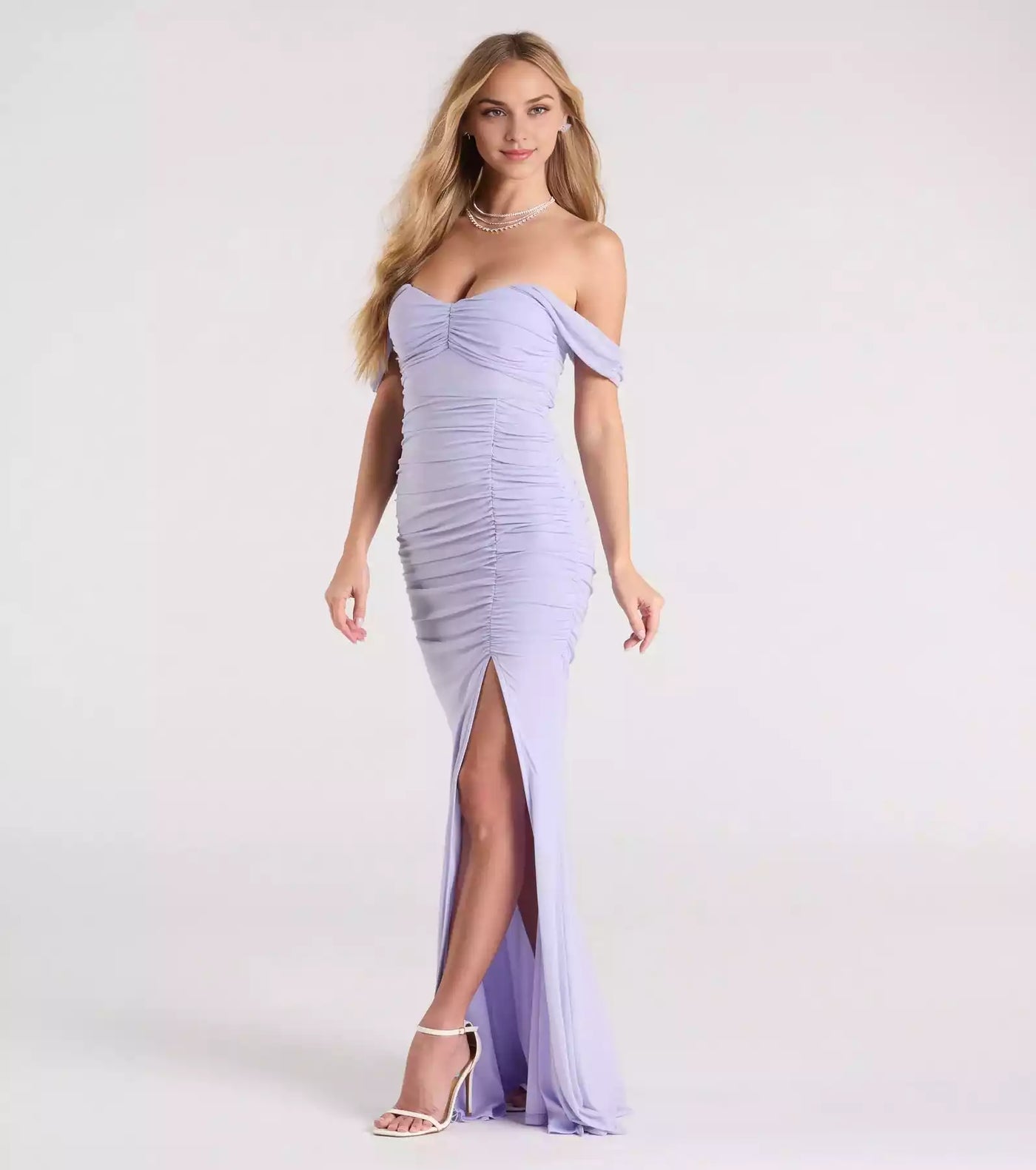 Elegant off shoulder heart-shaped neckline with high slit, pleated mermaid and floor Prom Dresses - US 2 / UK 6 / EU 32