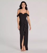 Exquisite crepe off shoulder heart-shaped neckline with adjustable thin shoulder straps, front slit with ruffle edge Prom Dresses