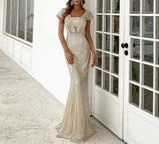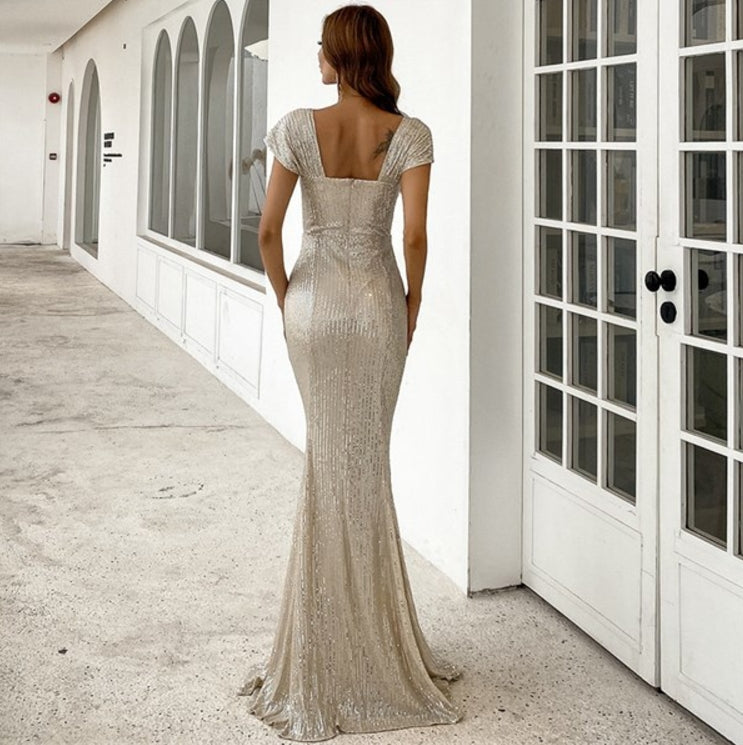 Gold Sequin Overlay Mermaid Ruched Bodice Prom Dresses With Straps
