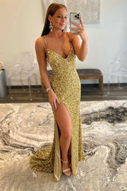 Gold V-Neck Mermaid Long Prom Dress with Slit