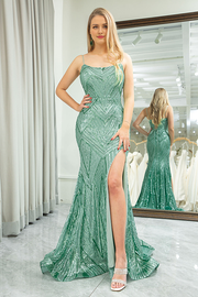 Green Mermaid Lace Up Back Long Prom Dress With Slit