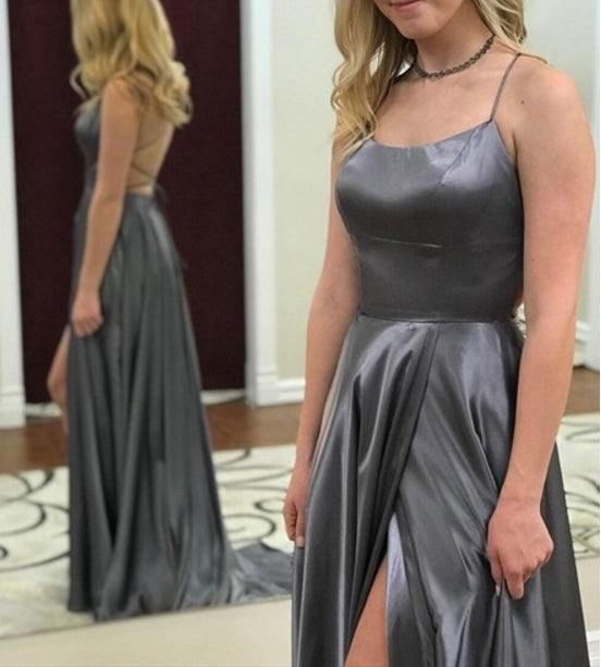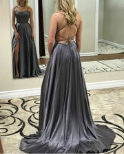 Grey Spaghetti Straps Side Split Long Prom Dress With