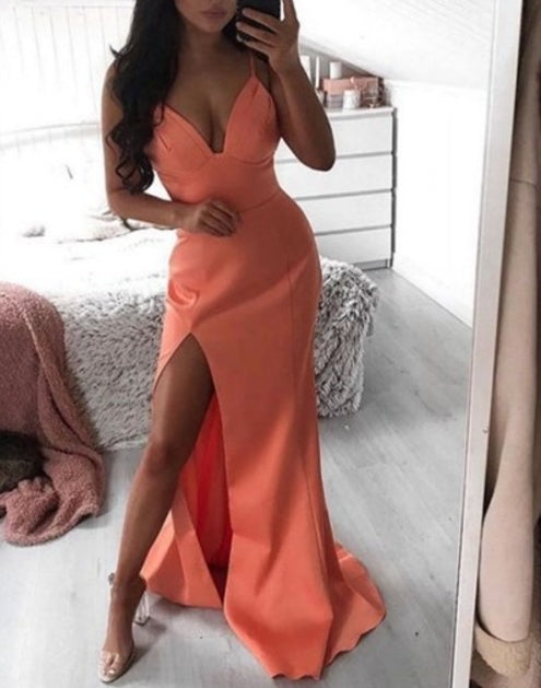 Long V-Neck Spaghetti Straps Pleated Satin Split Front Prom Dresses