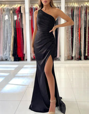Mermaid One Shoulder Long Satin Prom Dress With Split