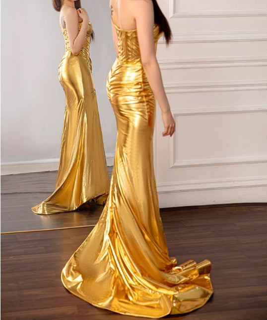 Metallic Gold Strapless Prom Dress