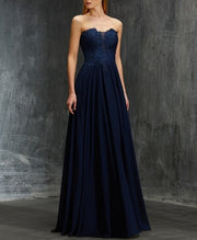 Navy Blue A-Line Strapless Lace Bodice Chiffon Bottom Prom Dress