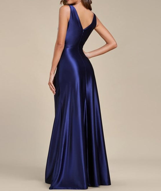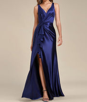 Navy Blue Prom Dresses Elegant V Neck Split Ruffles Wholesale Stain