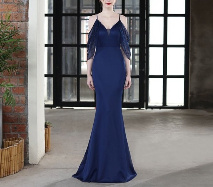 Navy Blue V-Neck Off The Shoulder Mermaid Prom Dresses