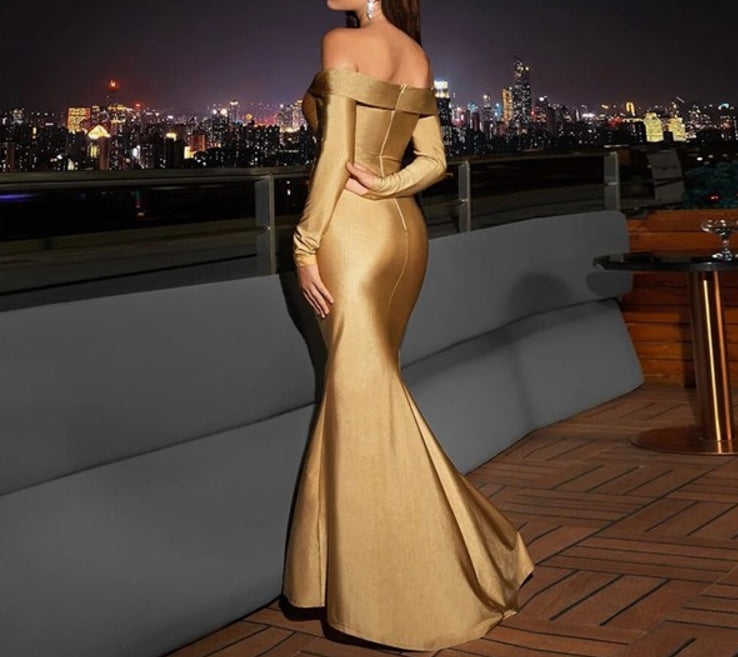 Off-Shoulder Backless Shirring Asymmetry Split Luxury Maxi Long Prom Dress - US 2 / UK 6 / EU 32