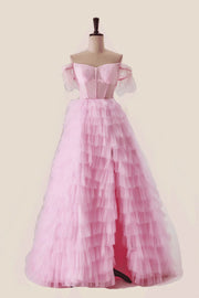 Off the Shoulder Pink Corset Tiered Ruffle Formal Prom Gown