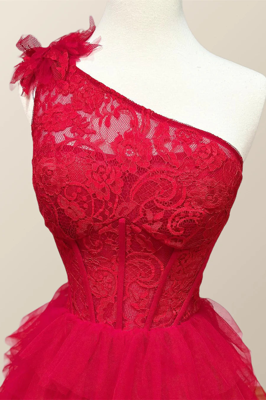 One Shoulder Lace and Tulle Tiered Ruffle Prom Dress