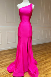 One-Shoulder Neon Pink Mermaid Long Formal Dress