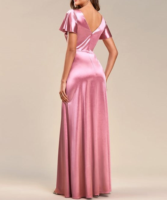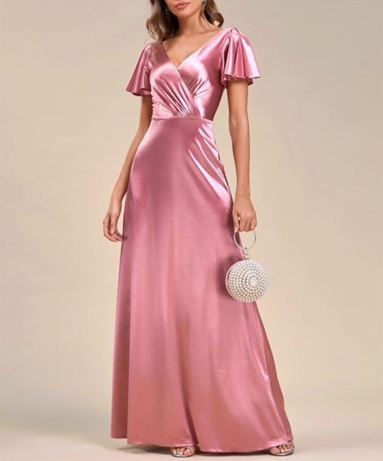 Orchid Prom Dresses V-Neck Fit A-Line Floor Longth Ruffles Sleeve Satin