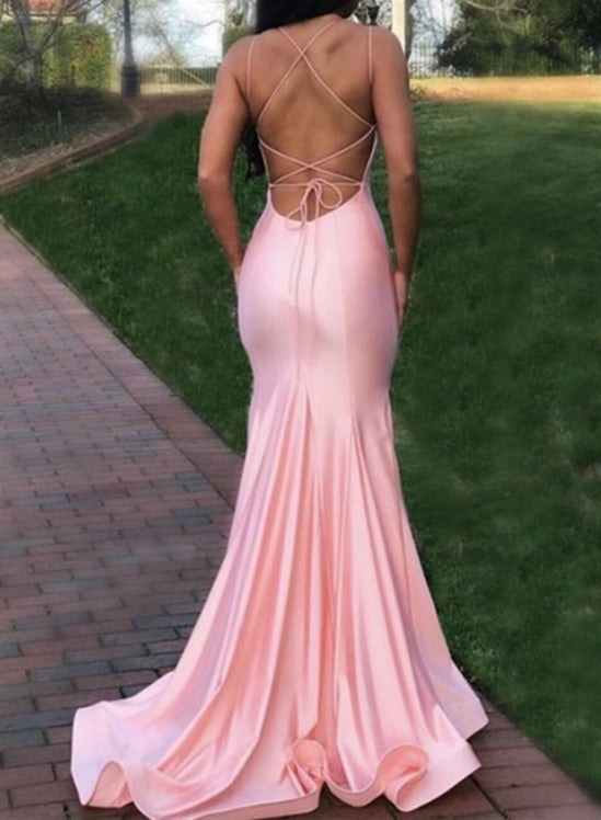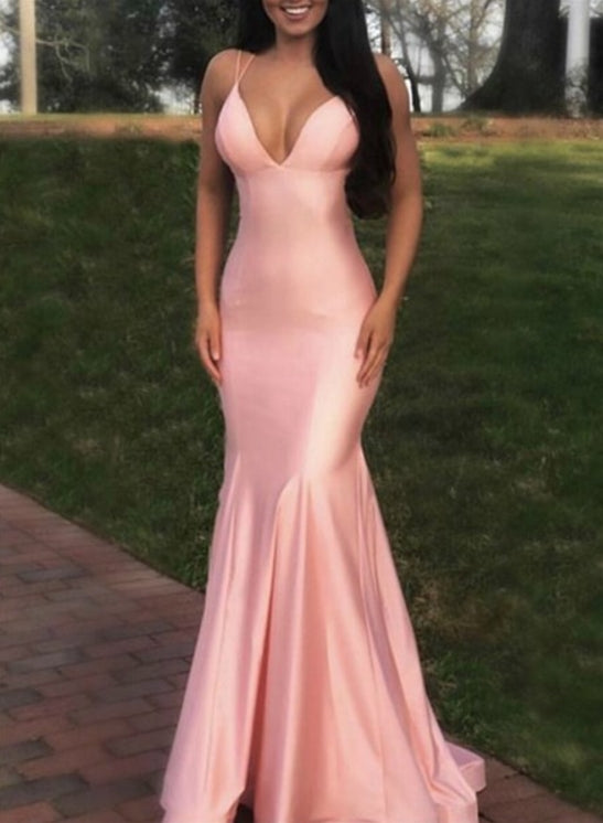 Pink Mermaid V Neck Spaghetti Strap Prom Dresses With