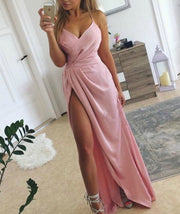 Pink V Neck Spaghetti Strap Satin Floor Length Prom Dresses With Split - US 2 / UK 6 / EU 32