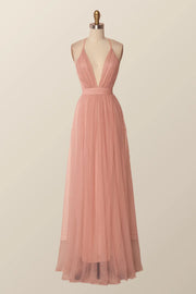 Plunge Pink Tulle A-line Long Formal Prom Dresss