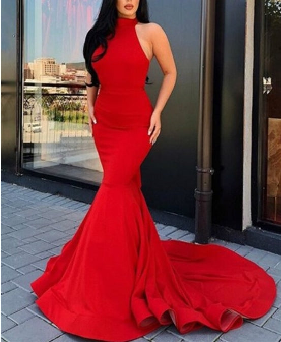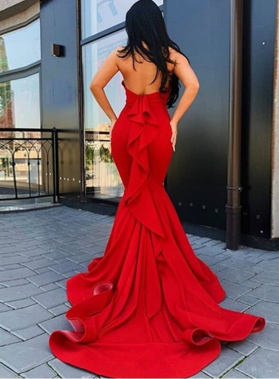 Red Mermaid Satin Halter Backless Long Prom Dress With Ruffle Back