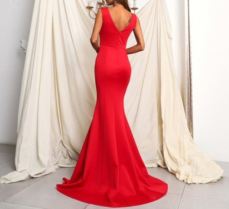Red Plunging V Neck Sleeveless Floor Length Mermaid Prom Dresses